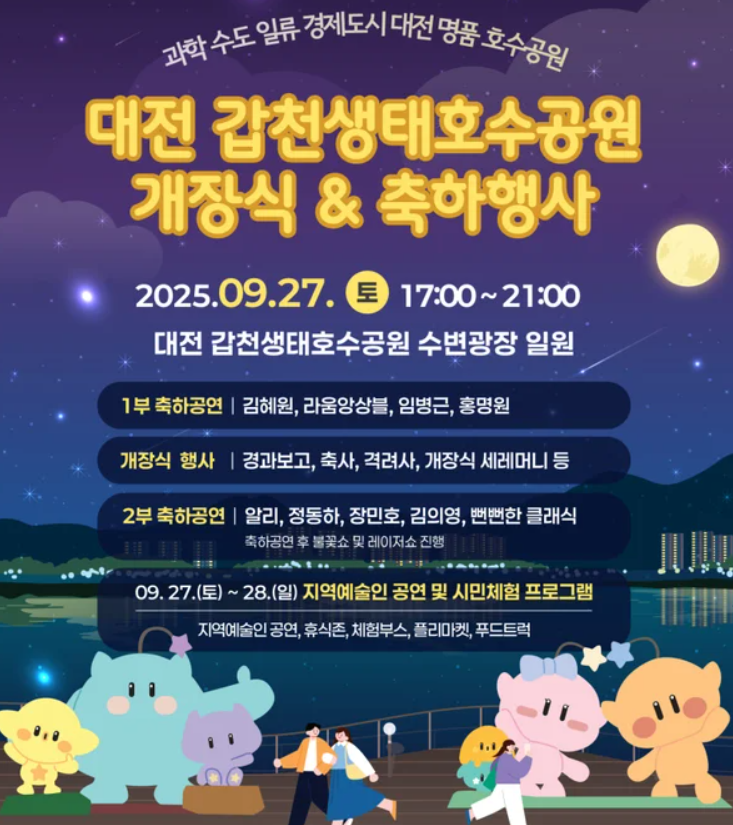 개장식은 2025년 9월 27일 토요일 오후 5시에 시작합니다. 지역 예술인의 오프닝 공연을 시작으로 성악과 클래식, K-POP 무대가 이어지고, 대전 출신 유명 가수들이 2부 무대를 장식합니다. 특히 마지막 하이라이트는 불꽃쇼와 레이저쇼로, 갑천 위로 터지는 불꽃이 대전의 밤하늘을 환하게 밝히며 개장을 기념합니다.